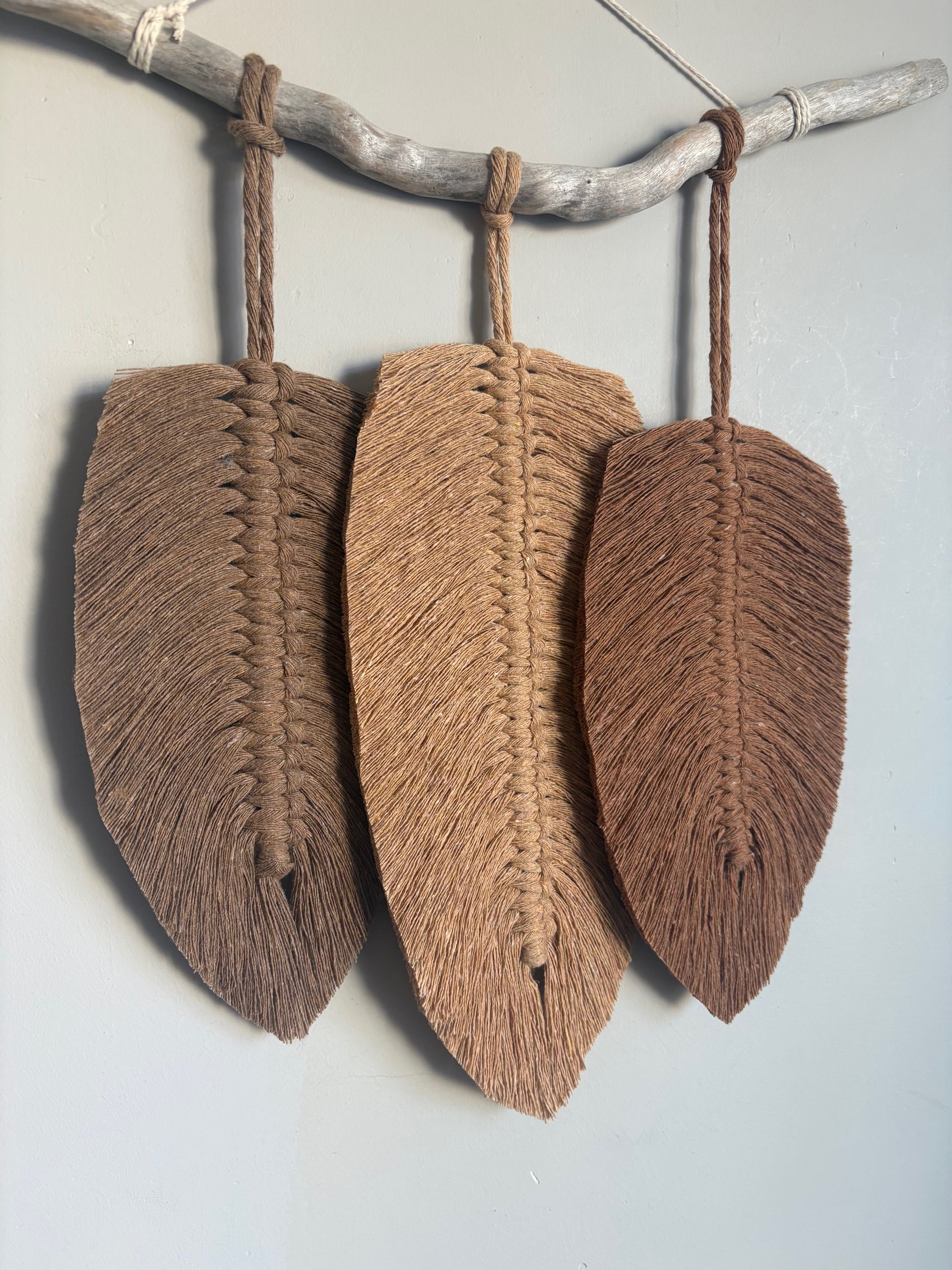 Feather wall hanging measuring approximately 12 inches wide by 12 inches long hanging on driftwood. This piece features brown tones.