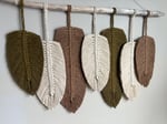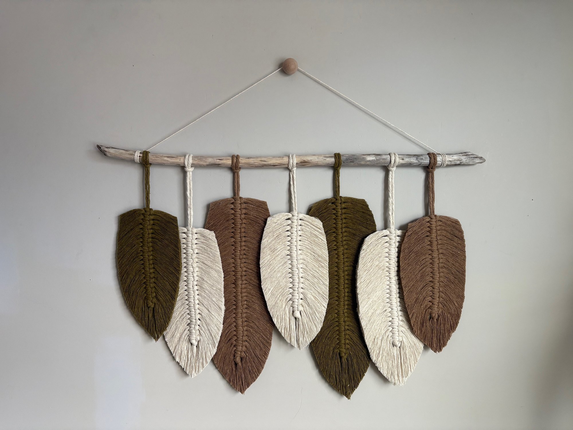 Feather wall hanging measuring 24 inches wide by 15 inches long hanging on driftwood. This piece features green, brown and cream tones and is a stunning feature piece on a wall.