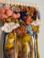 Mini woven wall hanging measuring 7" wide by 17" long hanging on a dowel. This piece features neutral colours. Handmade with art yarn from Twines and Lines, cotton cord from Niroma Studio, sari silk, cotton frizz and silk ribbon from UnFettered Supply and merino wool and fabric.